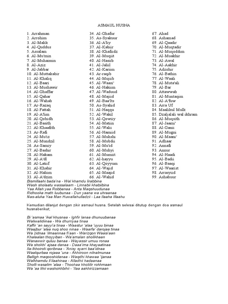 Doa asmaul husnah. Asmaul husna hanya layak disandang oleh allah swt sesuai kebesaran dan keagungan nya. Daftar 99 nama nama asmaul husna bahasa arab latin dan lengkap dengan artinya. Asmaul husna nama nama allah sebagai seorang muslim yang beriman mengetahui 99 nama nama allah merupakan sebuah keharusan.