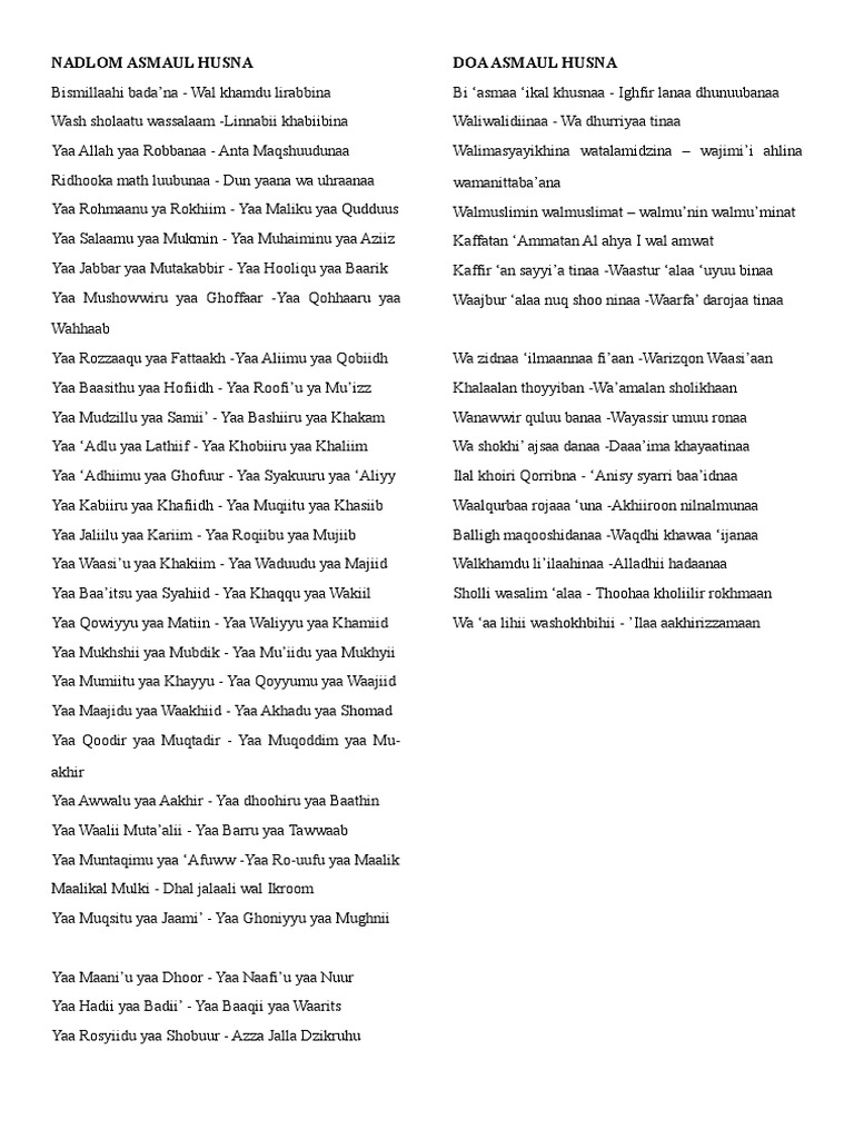 Doc Teks Doa Dalam Manzhumah Asmaul Husna Dan Terjemahnya