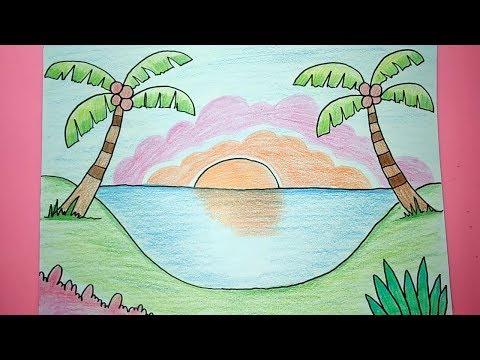 Cara Menggambar Dan Mewarnai Pemandangan Sunset Dan Pantai Drawing Sunset Scenery Gradasi Crayon