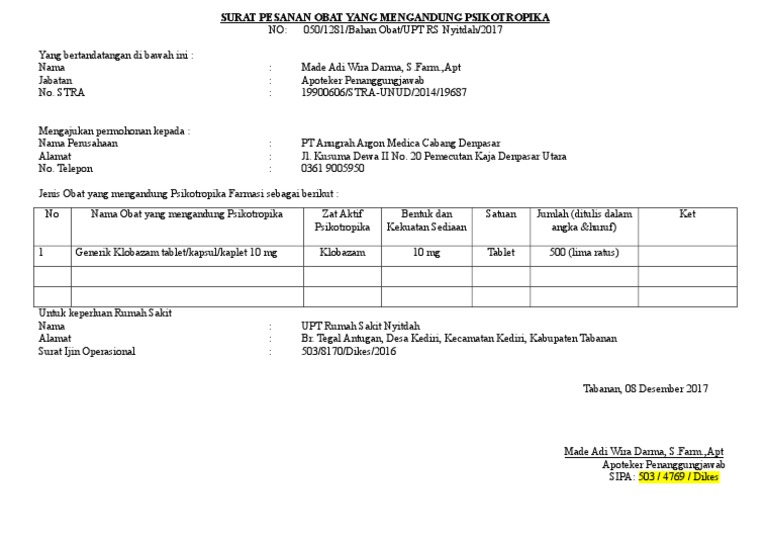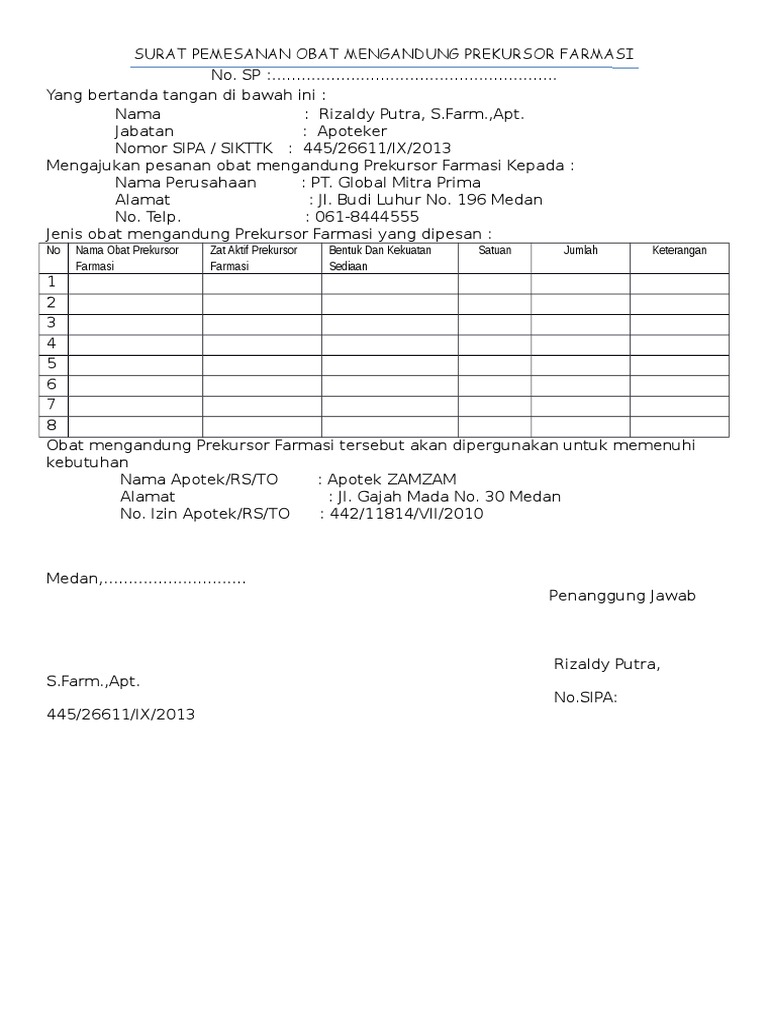 Contoh surat pesanan obat psikotropika. Surat pesanan obat psikotropikasp prekursorsp biasa. Perum polda cempaka permai blok e no. Contoh surat pesanan obat.